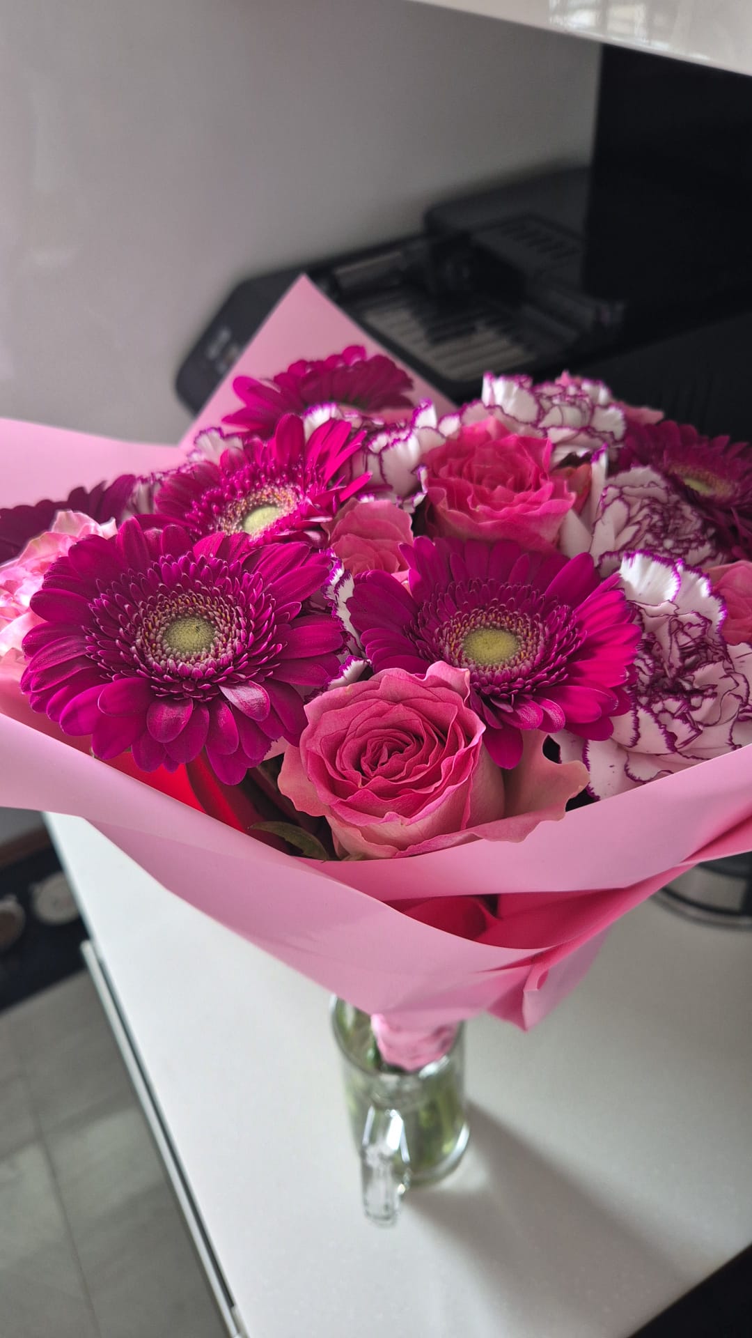 Prześlij delikatną wiązankę kwiatową kochanej osobie jeszcze dzisiaj! Ukazany bukiet składa się z róż, gerber i goździków w różowo-jasnej kolorystyce, znakomicie sprawdzi się jako upominek na poprawę humoru. Do okazałego bukietu dodany jest nieodpłatny karnecik, na którym możesz przesłać życzenia. Papier stanowi nowoczesną formę dekoracji bukietu. Papieru nie należy usuwać przed włożeniem do wazonu, gdyż stanowi integralną część dekoracyjną kompozycji. Bukiet nie zawiera zielonego przybrania.